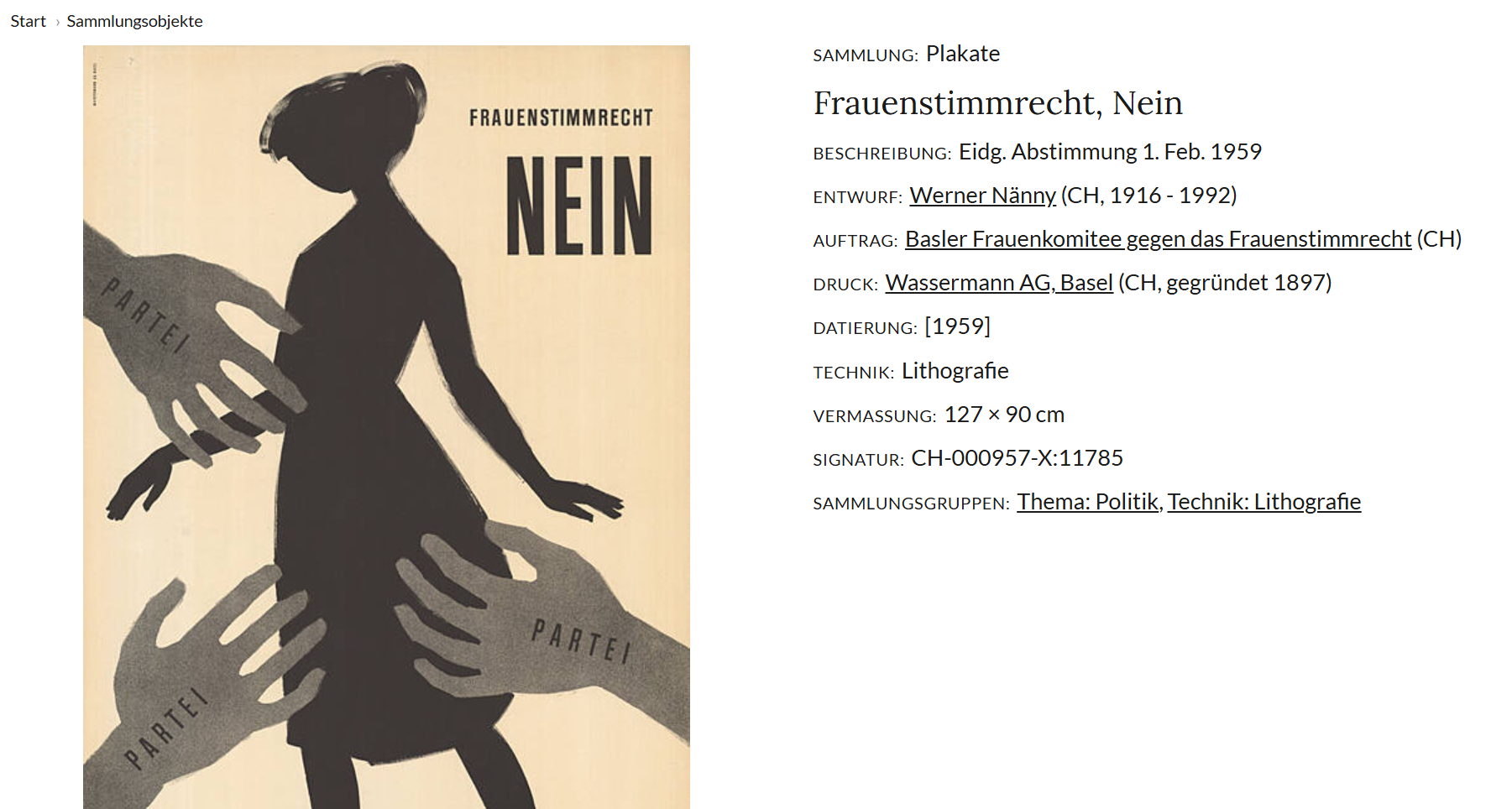 Ein Blick in die deutschsprachige Archive zeigt, dass vielerorts bereits auf die -Prinzipien bei Metadaten geachtet wird. Eine diskriminierungssensible Metadatenpraxis bleibt jedoch meist aus. Oft fehlen kontextualisierende Beschreibungen, in denen Diskriminierungsformen explizit benannt und in ihren jeweiligen historischen Kontext eingeordnet werden. Im Online-Katalog der “Plakatsammlung der Schule für Gestaltung” beschränkt sich die Beschreibung des Plakats “Frauenstimmrecht, Nein” auf sachliche Angaben: “Eidgenössische Abstimmung, 1. Februar 1959”. Hinweise auf den historischen, politischen und insbesondere den sexistischen Kontext fehlen.