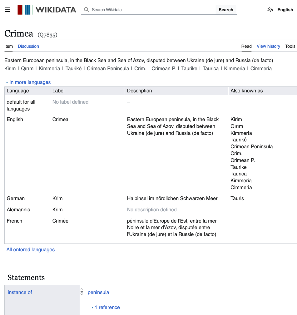 Dieses kartografische Beispiel steht paradigmatisch für die normativen Setzungen, die auch digital kodierten Datenstrukturen wie Wikidata zugrunde liegen. So wird die Krim dort sowohl als Teil der Ukraine (“de jure”) als auch Russlands (“de facto”) geführt, jedoch übernehmen viele verknüpfte Objekte wie Städte oder administrative Einheiten diese Mehrdeutigkeit nicht konsistent oder bilden einzig die ukrainische Perspektive ab. Die Karte operiert dabei mit einem klaren Framing zugunsten der ukrainischen Souveränität und blendet alternative Klassifikationsoptionen, wie etwa die Bezeichnung “Republik Krim” als Teil Russlands, weitgehend aus.